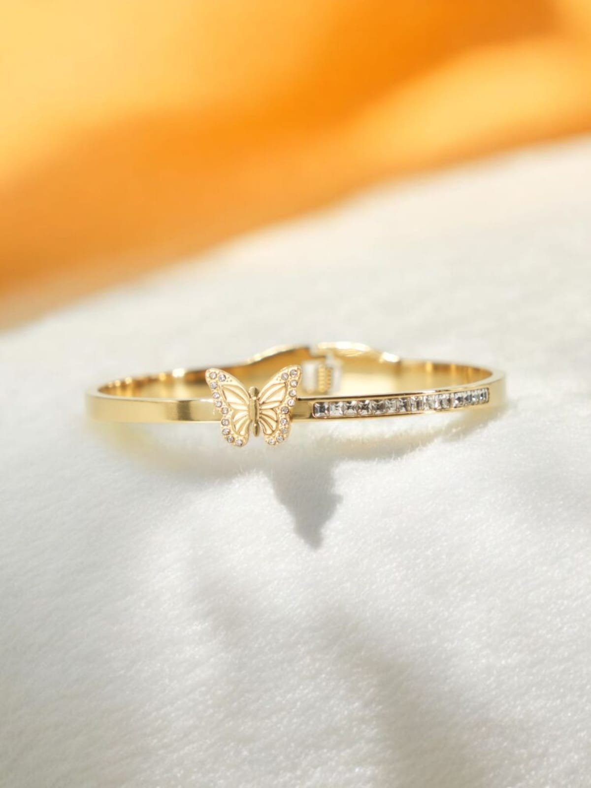 Let your style take flight with our Butterfly Whisper Bracelet, featuring a detailed golden butterfly charm resting beside a sleek crystal-studded bar. Crafted in a smooth anti-tarnish gold finish, this piece adds a light and graceful touch to your everyday elegance or special occasion look.