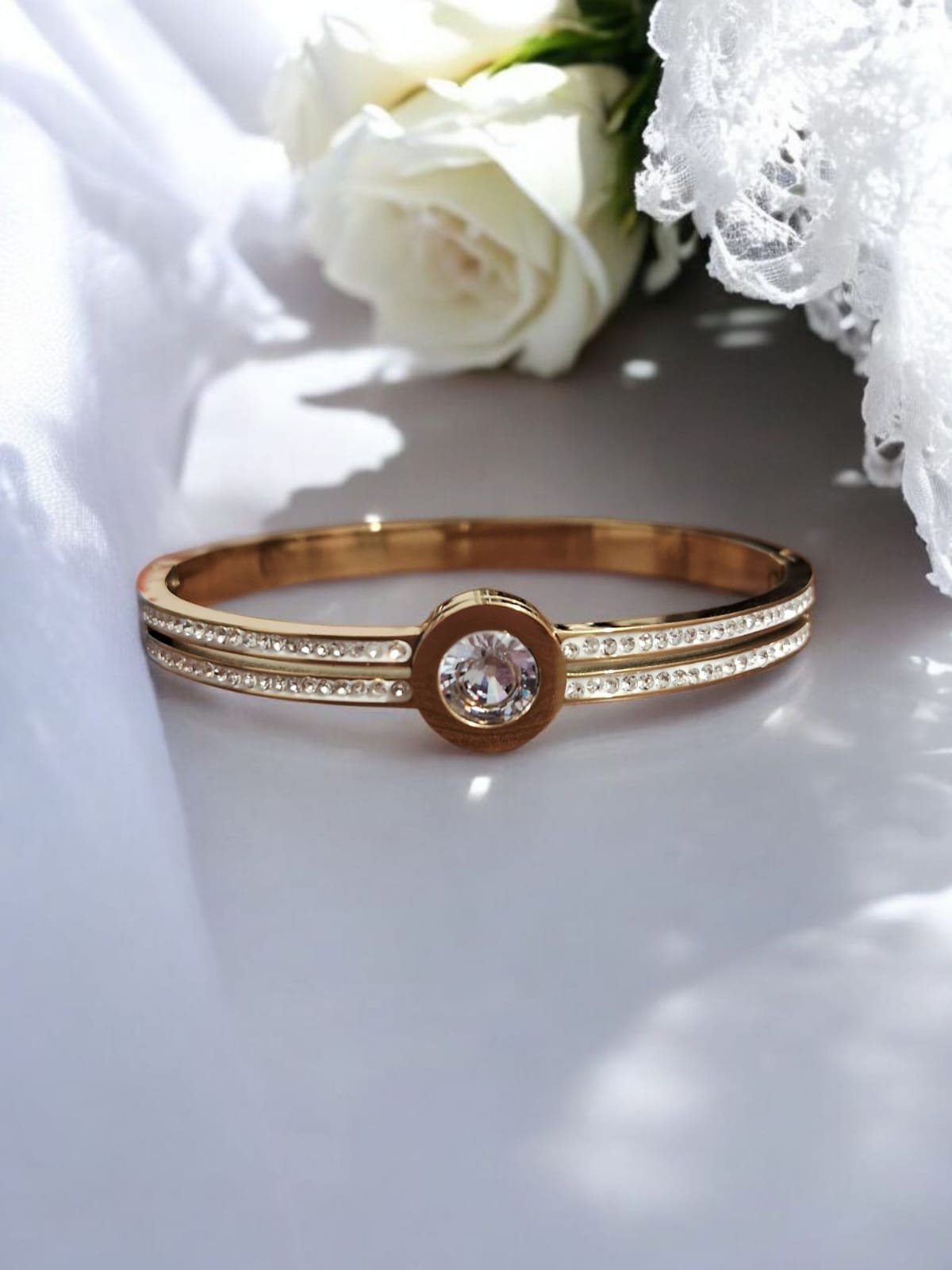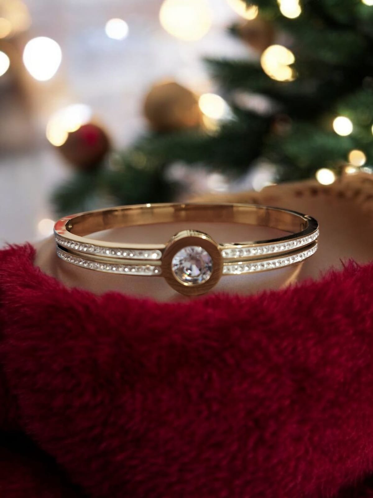 Make a statement of grace with the Celeste Solitaire Bracelet. Featuring a sparkling round centerpiece embraced by dual crystal-lined gold bands, this bracelet is perfect for adding effortless glamour to both festive evenings and elegant daywear. Finished in anti-tarnish gold for long-lasting shine.
