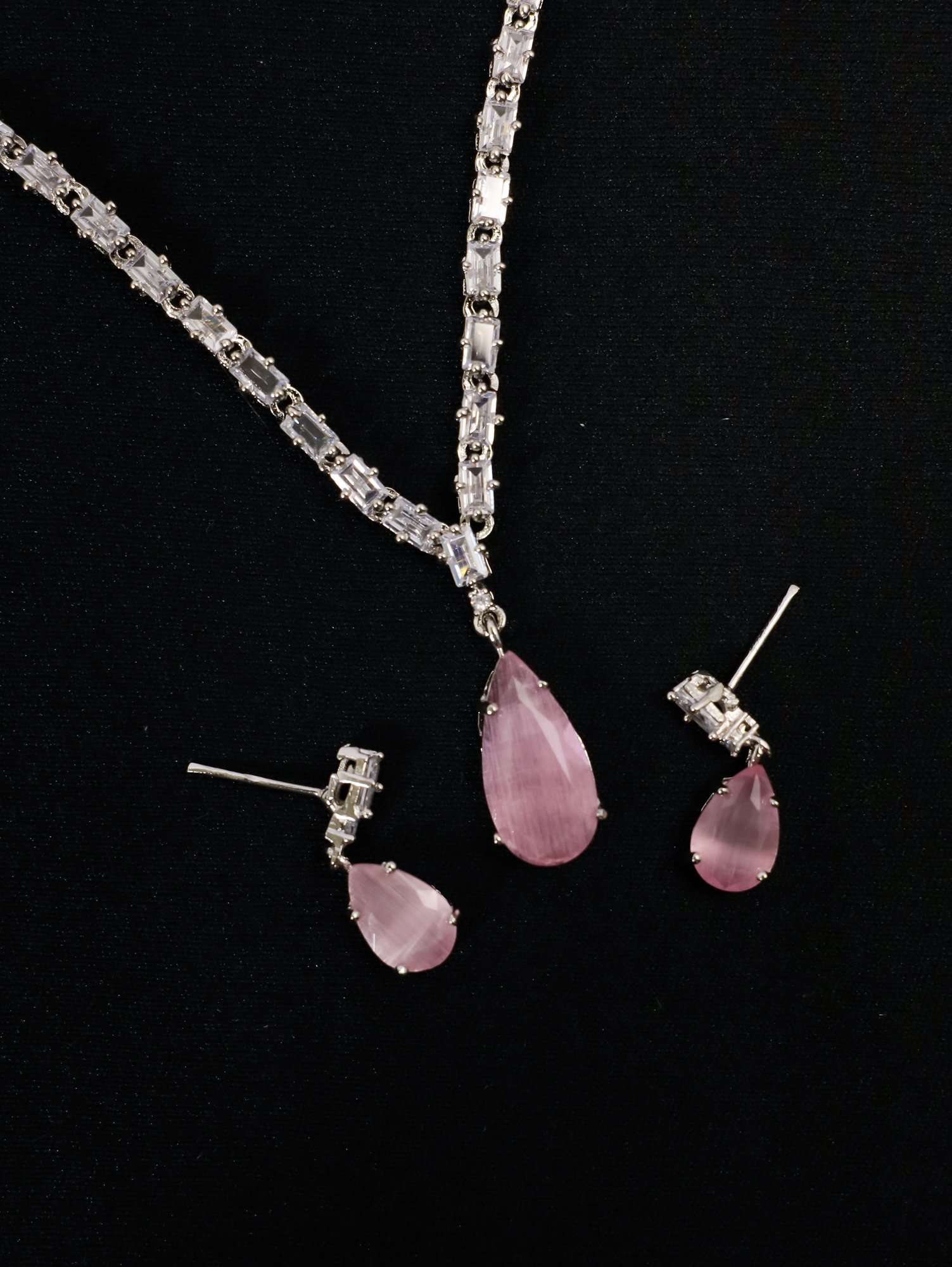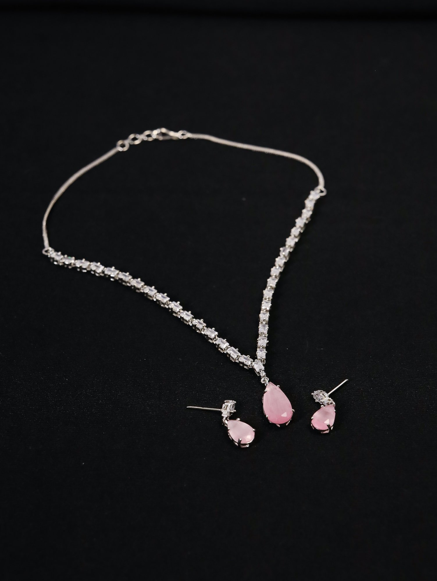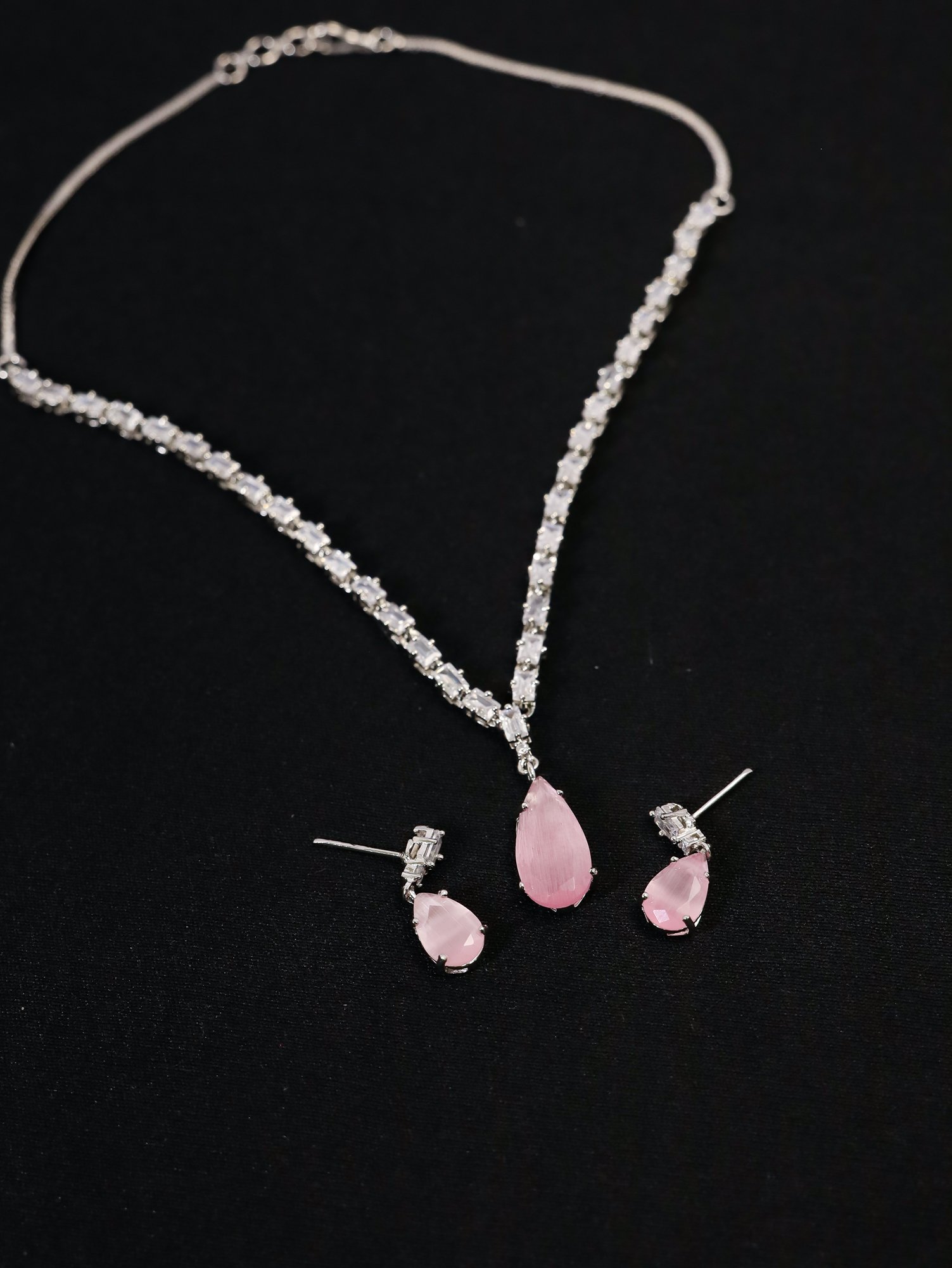 A charming and delicate necklace that adds a soft glow to any attire, making it perfect for evening get-togethers and romantic dinners. It enhances its beauty when styled with pearl earrings and an elegant pink chiffon saree.