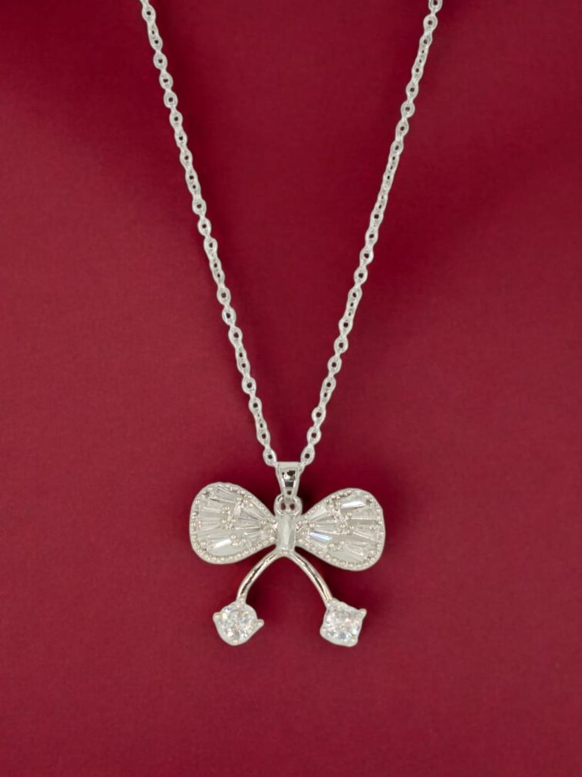 Delicate yet dazzling, the Crystal Bow Charm Pendant features a silver-toned bow encrusted with fine baguette-cut stones and finished with two sparkling round drops. It brings a touch of elegance and femininity to your everyday look — perfect for gifting or treating yourself to something sweet and chic.