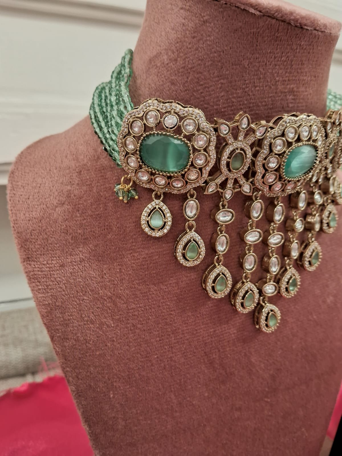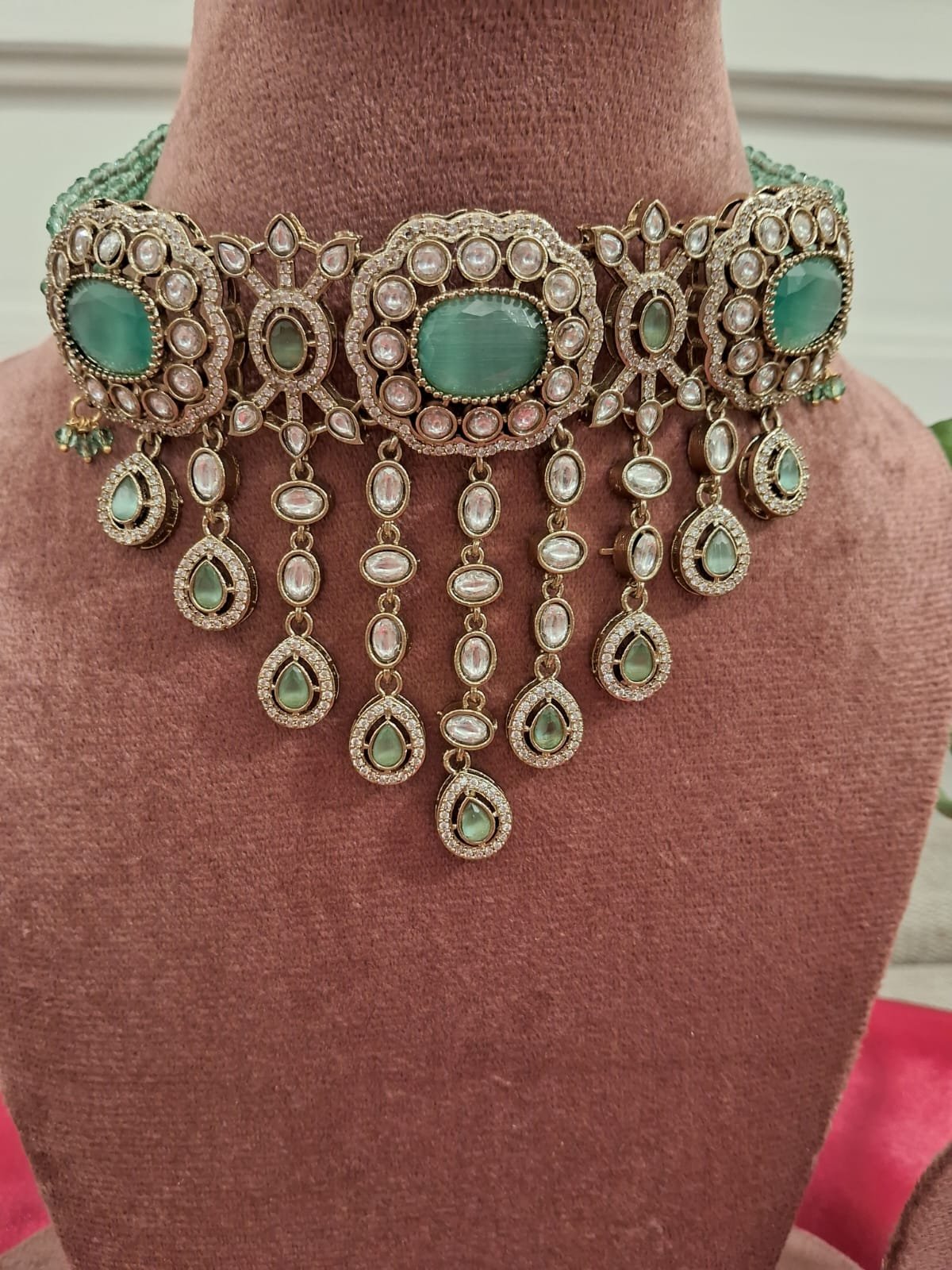 Turn heads with our exquisite Green Moissanite Necklace, crafted to perfection for those who love luxury with a hint of royalty. With sparkling moissanite stones and elegant gold plating, this piece adds the perfect statement to your festive or wedding look.