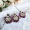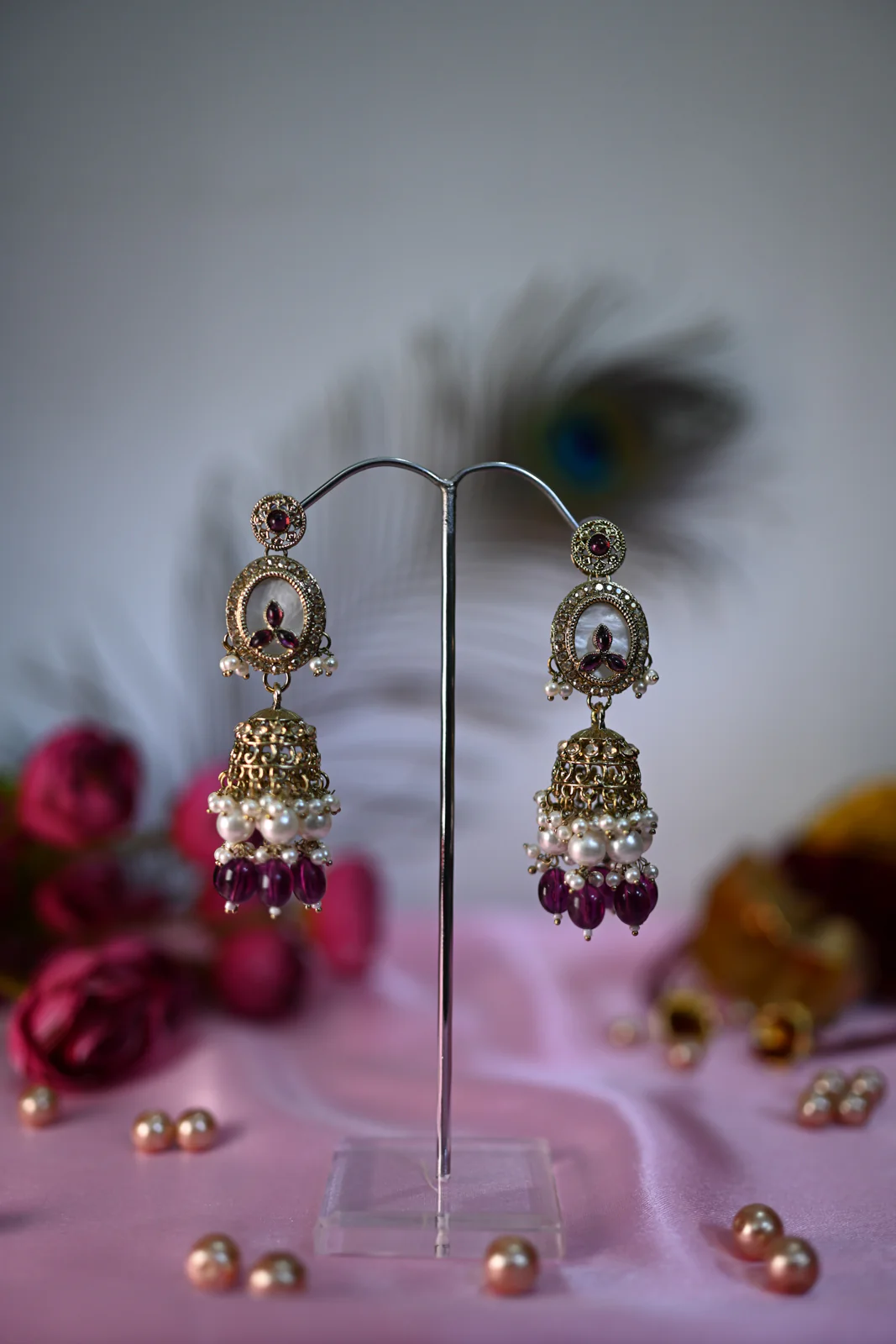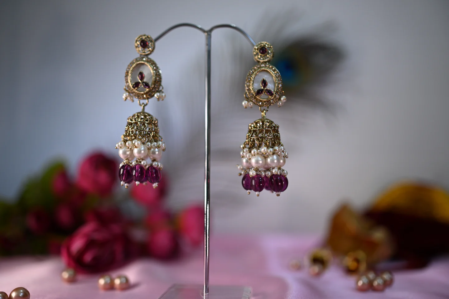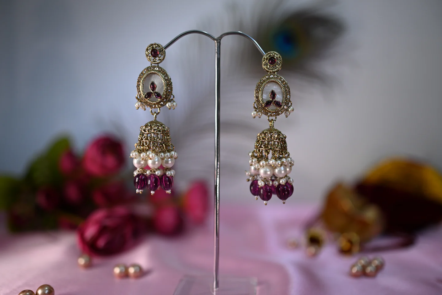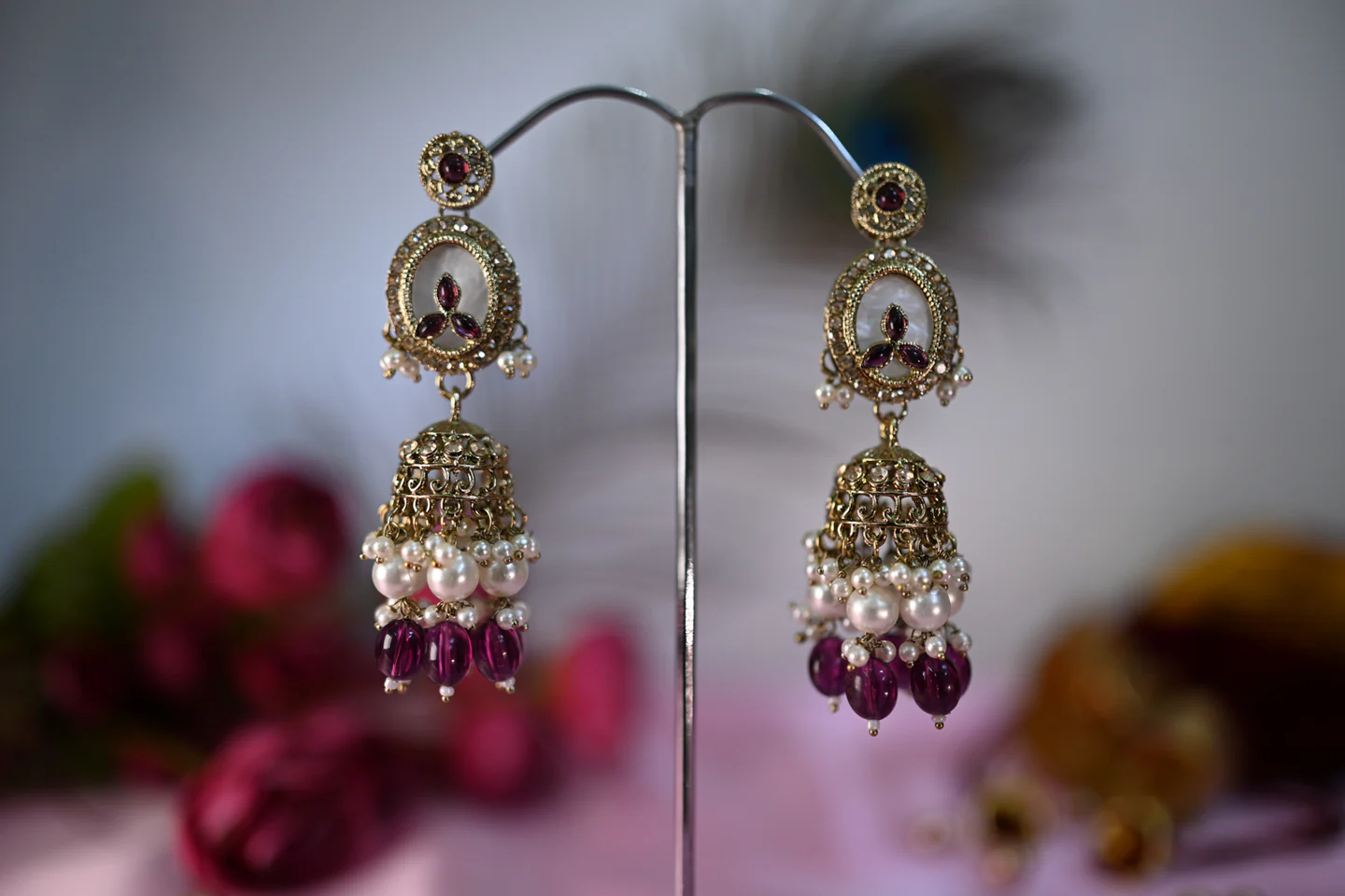 Inspired by Mughal elegance, these jhumkis feature soft white pearls and deep purple hues, creating a royal yet delicate charm. They’re perfect for adding a traditional touch to any look.