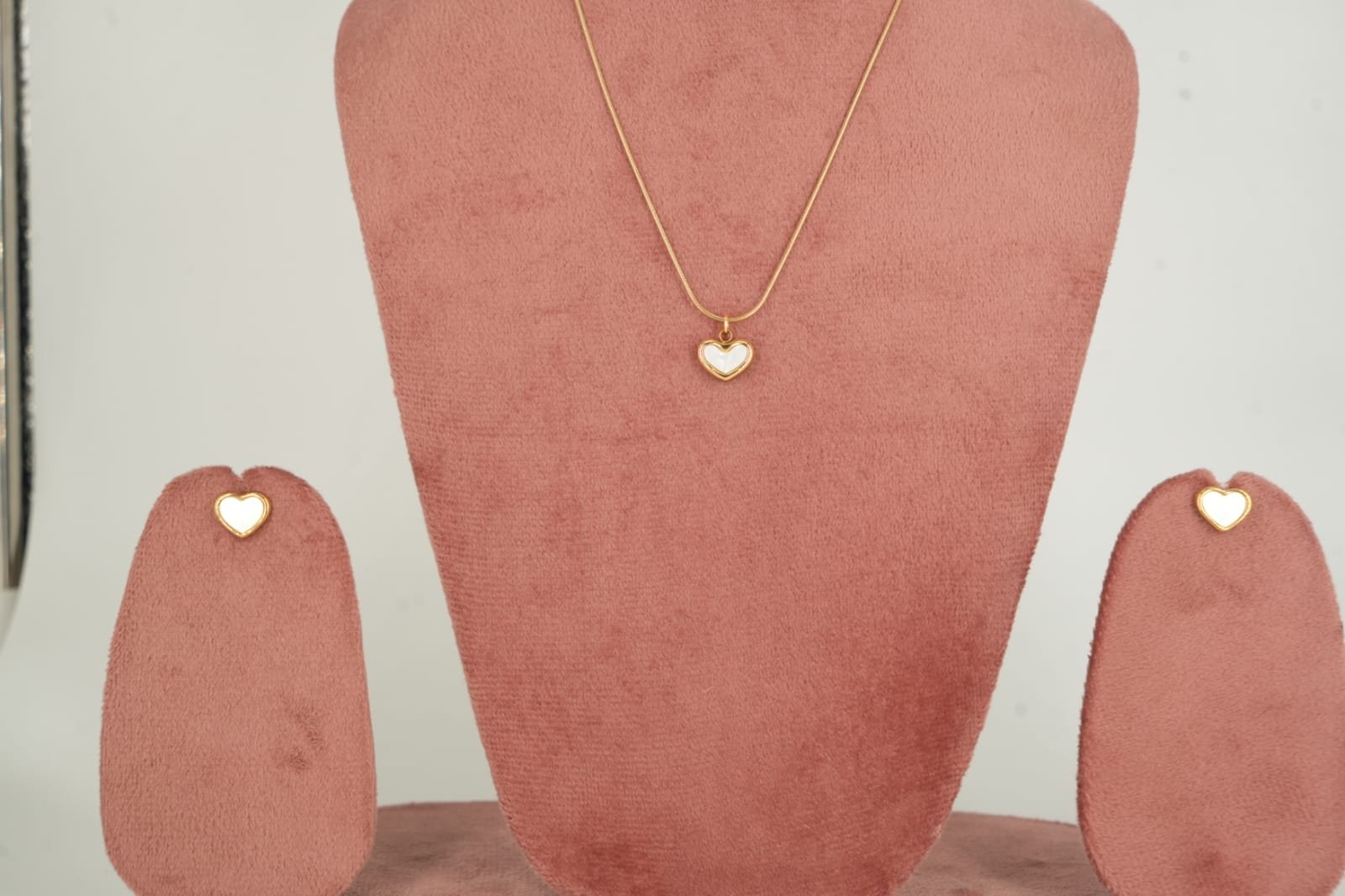 Delicately crafted with a heart-shaped white inlay, this pendant and stud set is the perfect symbol of simplicity and love. Light, elegant, and ideal for everyday wear or gifting.