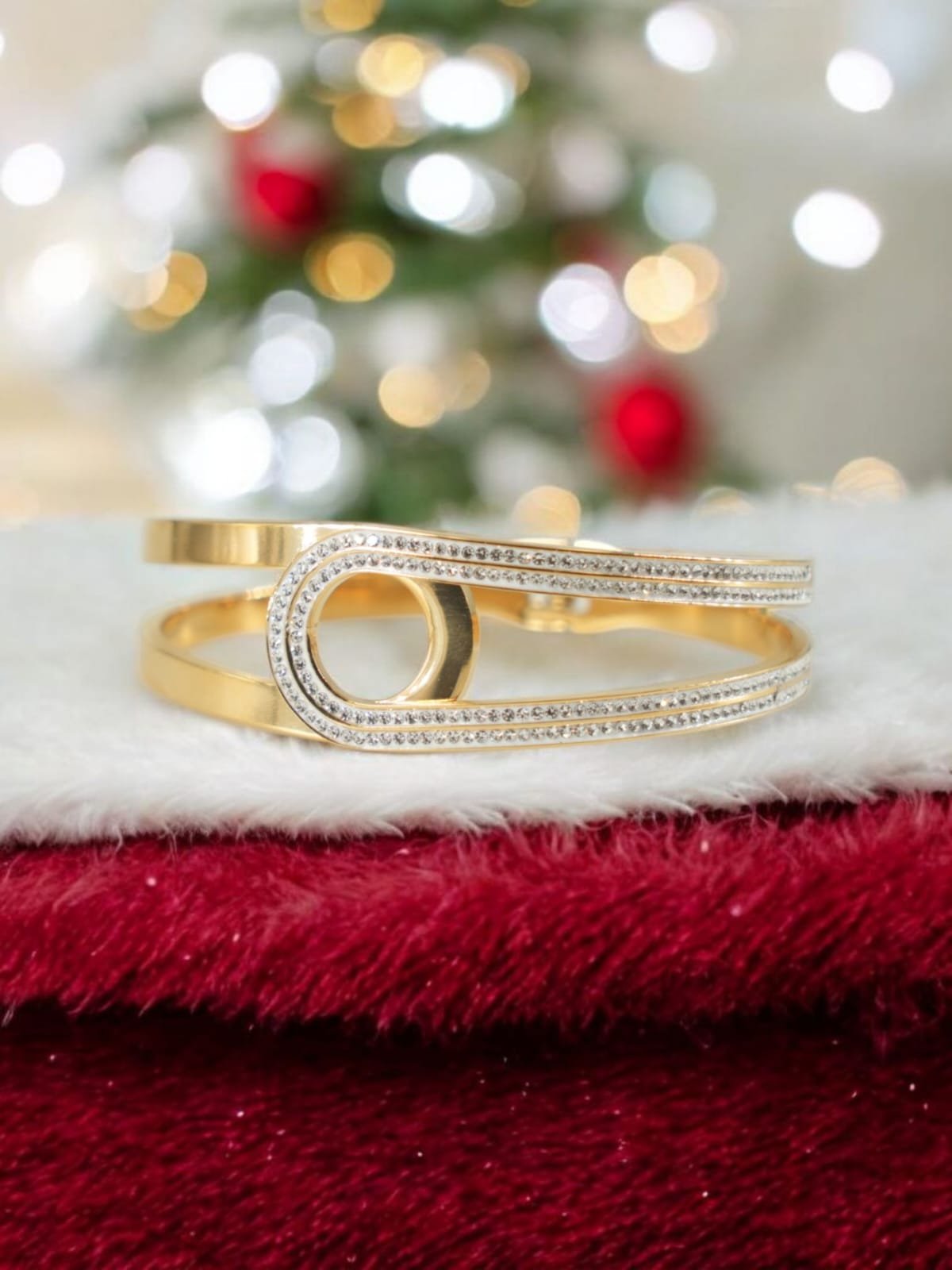 Turn heads with our Infinity Loop Bracelet, featuring a fluid, modern looped design in a radiant anti-tarnish gold finish. Accented with twin rows of fine crystals, this statement piece adds sparkle and sophistication to any outfit — from festive glam to evening elegance.