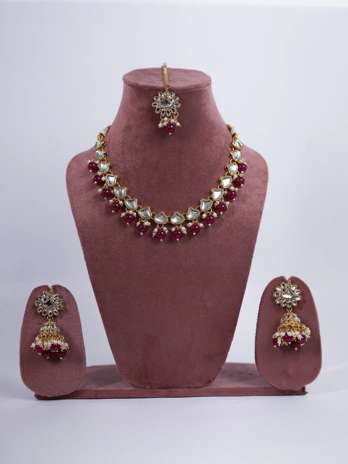 This stunning gold Kundan necklace set is designed for timeless elegance, featuring pearl embellishments arranged in a graceful pattern. Paired with matching pearl-studded jhumka earrings and a delicate maang tikka, this set is a must-have for weddings and festive occasions, adding a touch of royalty to your ensemble.