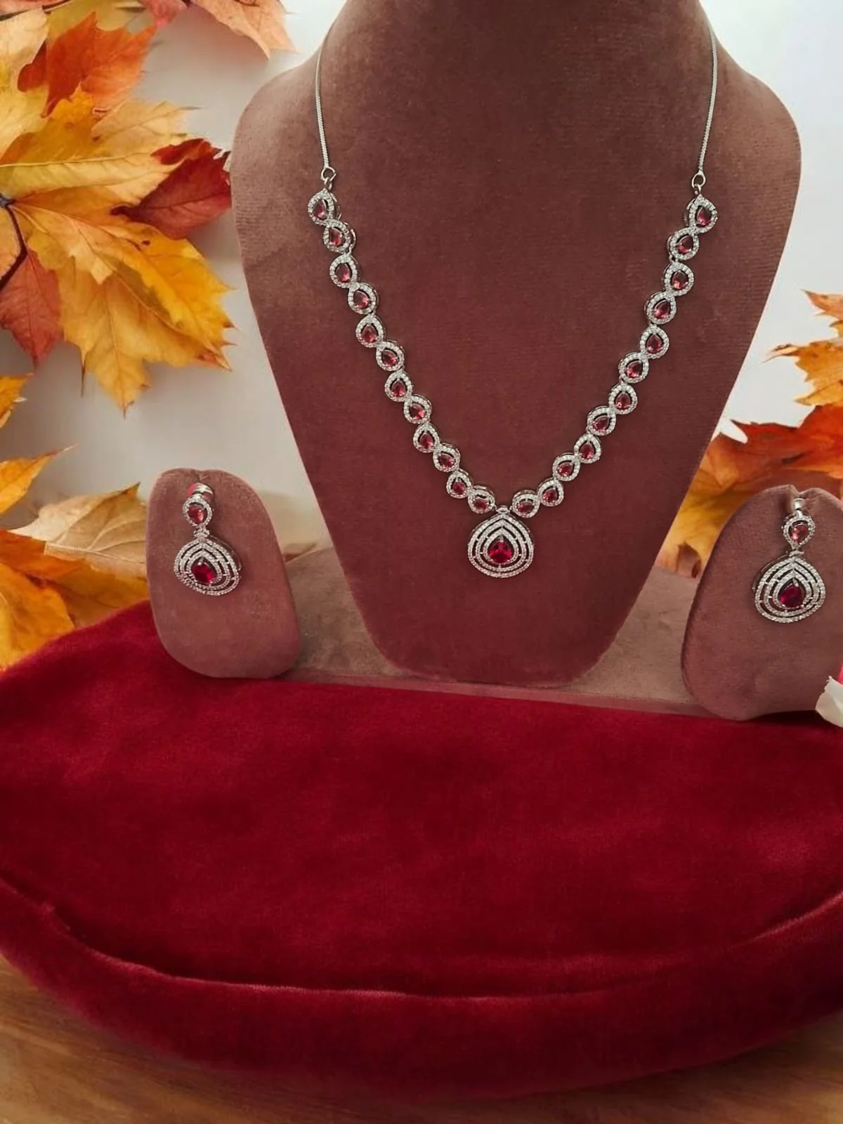 Rich ruby stones and shimmering zirconia come together in this stunning necklace, making it a must-have for any festive occasion. Pairs beautifully with deep red or beige outfits.
