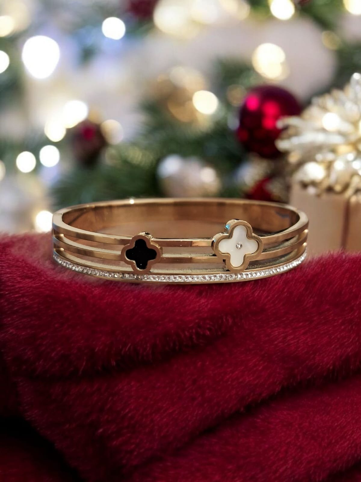 Sophisticated and festive, the Midnight Pearl Bracelet features a timeless mix of black and white enamel clovers, resting on a triple-band gold frame lined with delicate crystals. Its anti-tarnish finish and sleek silhouette make it perfect for both grand occasions and elevated everyday looks.