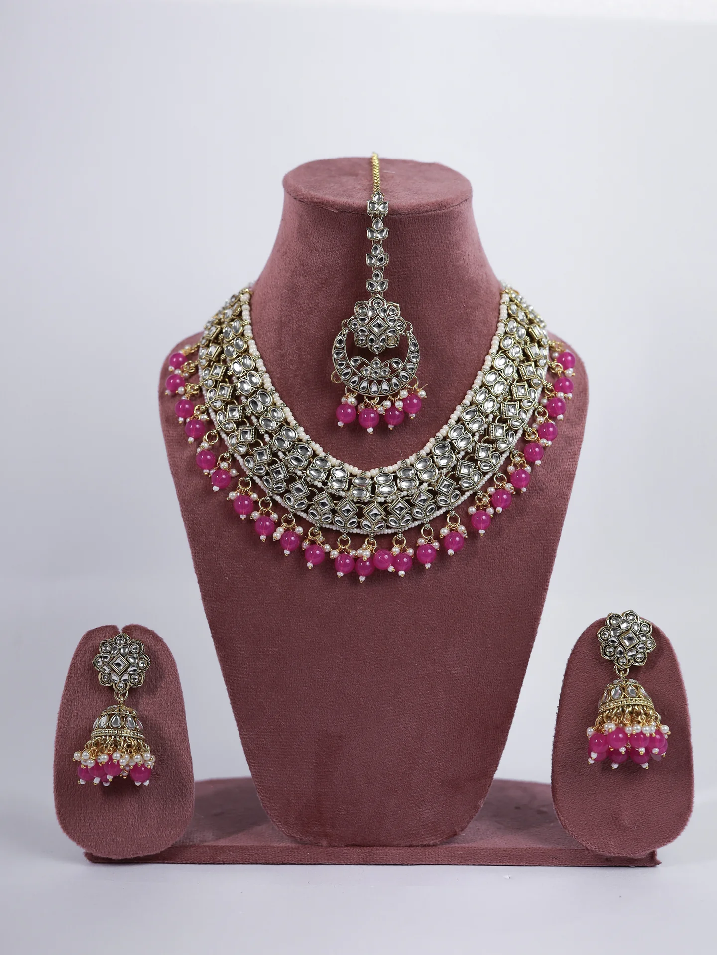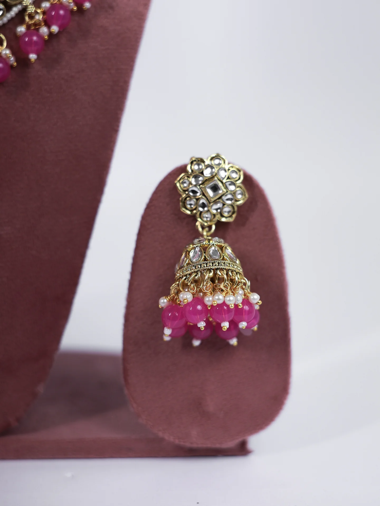 Niia Kundan Pearl Pink Necklace With Jhumkis And Tikka