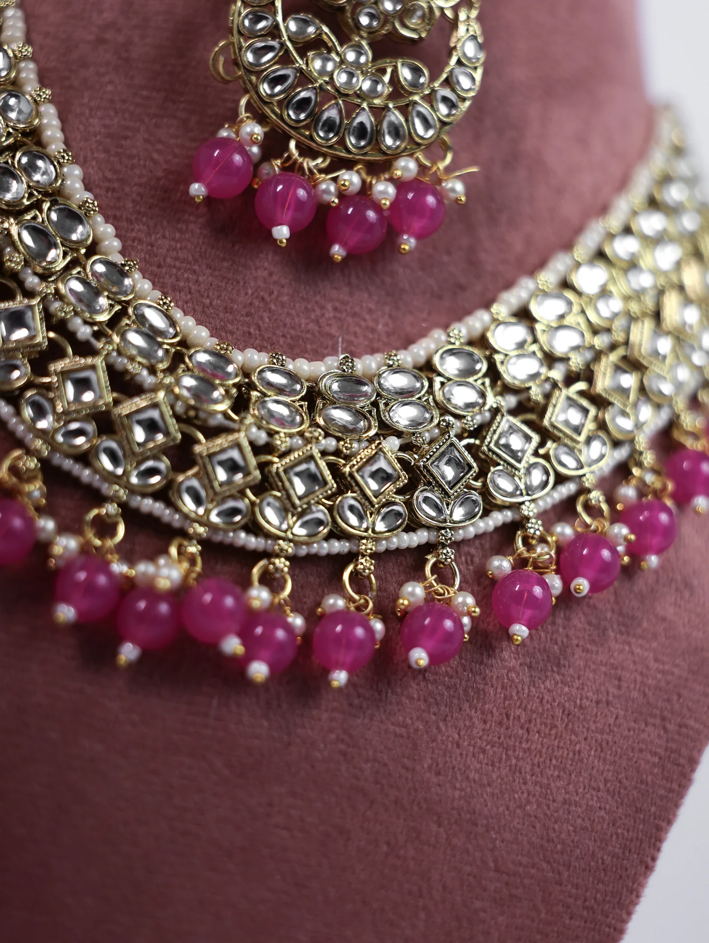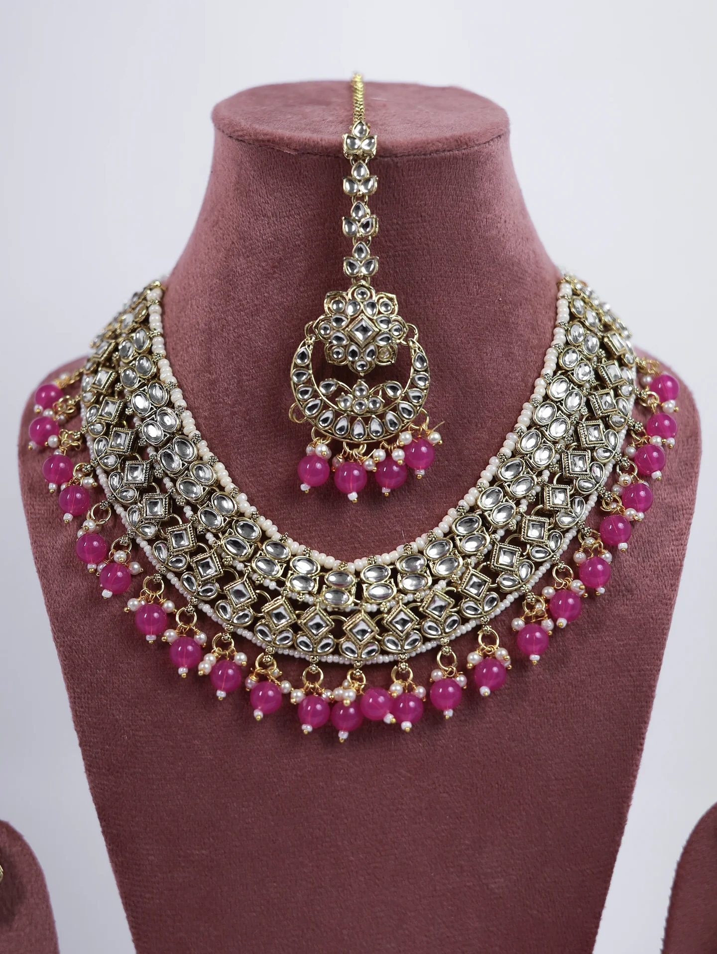 The Kundan Pearl Pink Necklace with Jhumkis and Tikka is a stunning blend of tradition and elegance. Adorned with intricate Kundan work and lustrous pearls in a soft pink hue, this set radiates royal charm. The matching Jhumkis and Tikka enhance the overall look, making it perfect for weddings, festive occasions, and grand celebrations. Designed for comfort and sophistication, this lightweight jewelry set is easy to wear all day. Elevate your style with this timeless piece that adds grace and glamour to any outfit.