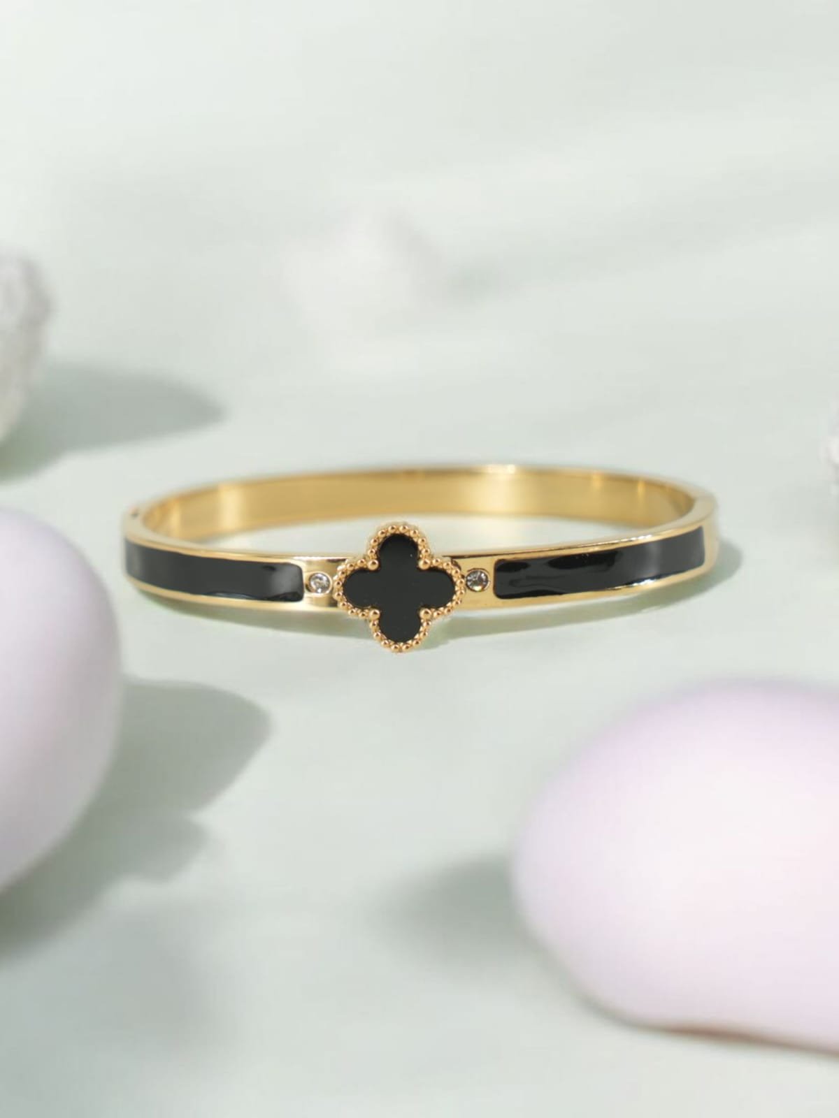 Embrace bold elegance with our Noir Bloom Bracelet, featuring a sleek black enamel band and a delicate clover-shaped charm outlined in gold. Finished with minimal crystal studs for a soft hint of sparkle, this piece blends modern flair with a timeless touch — ideal for both everyday styling and evening looks.