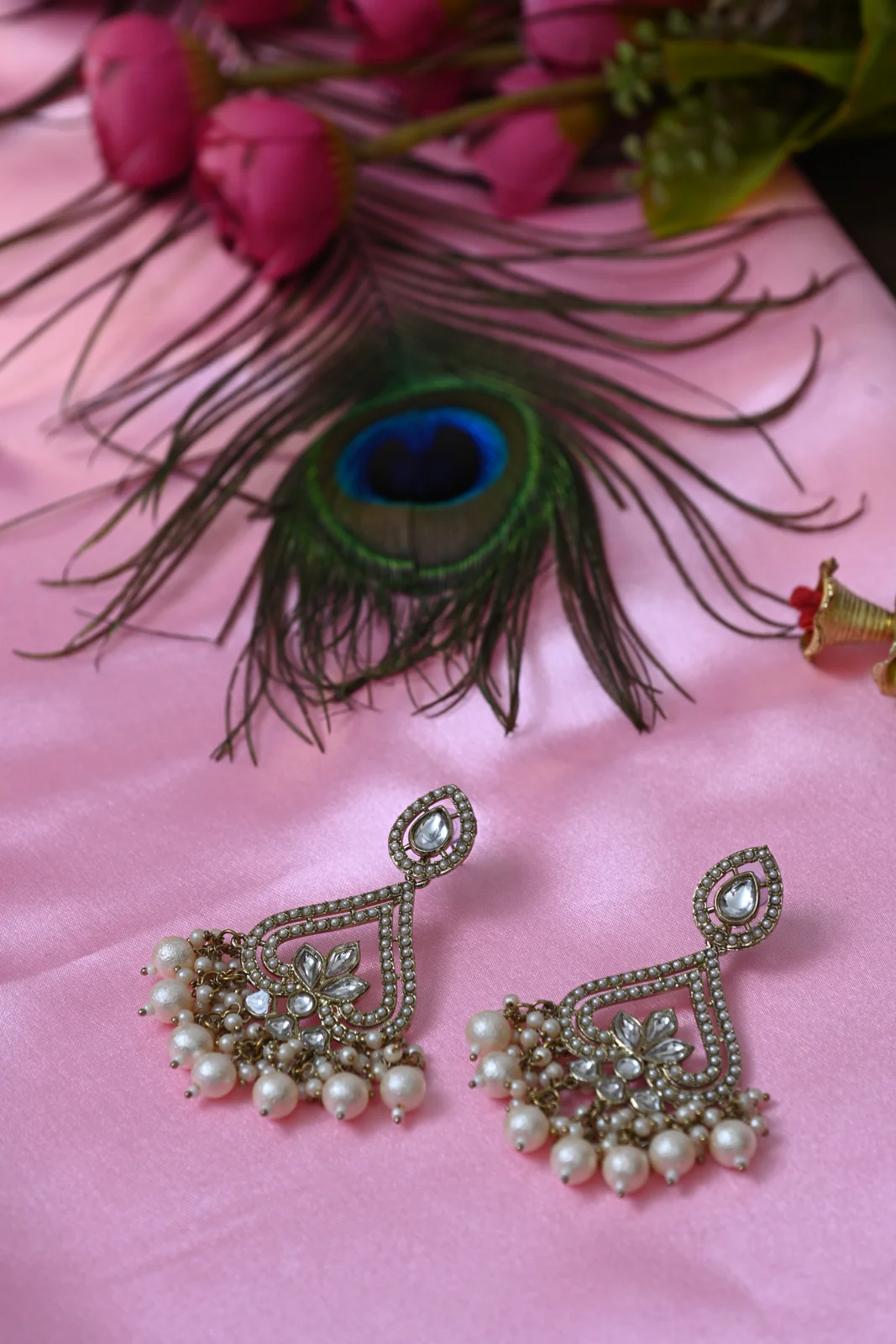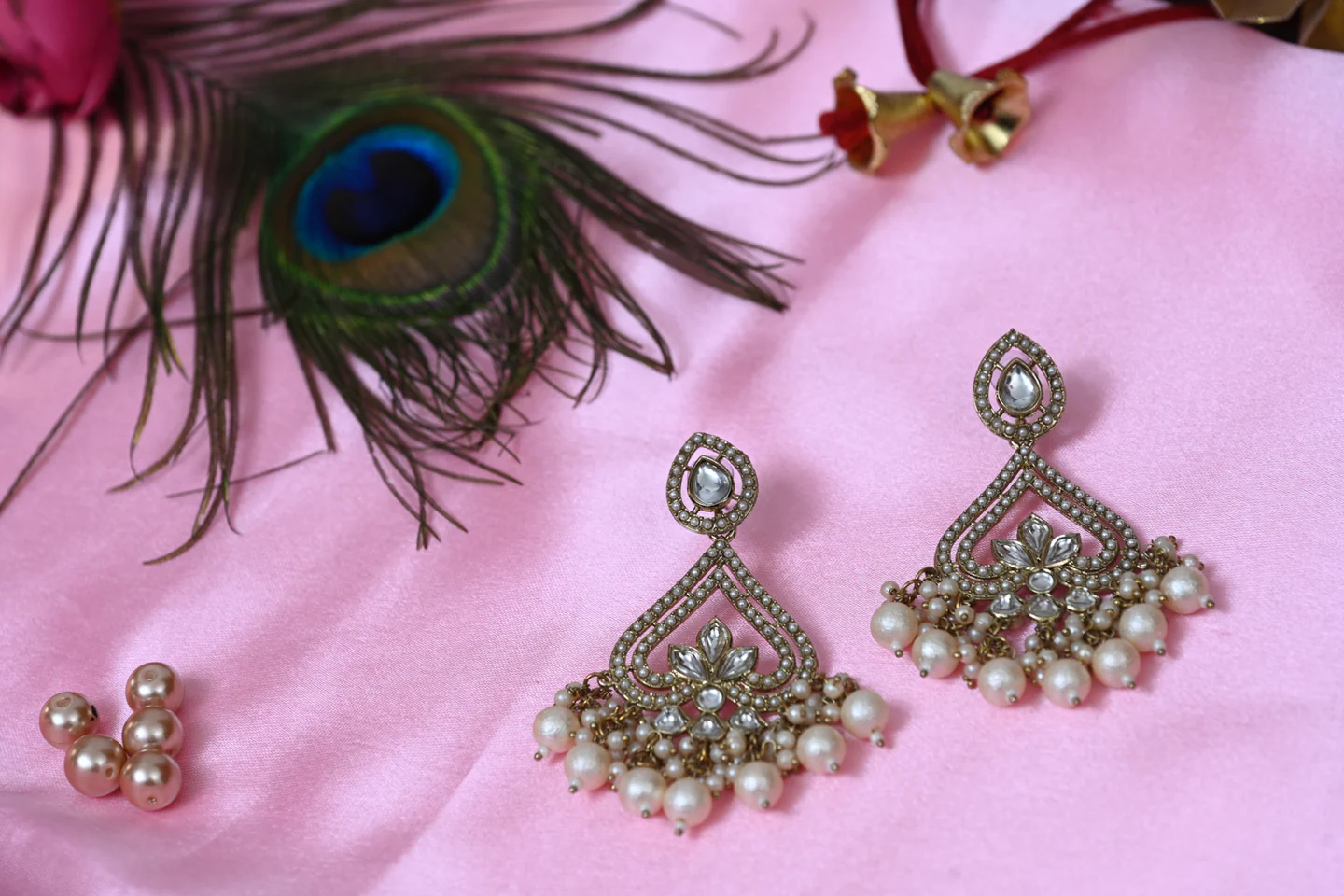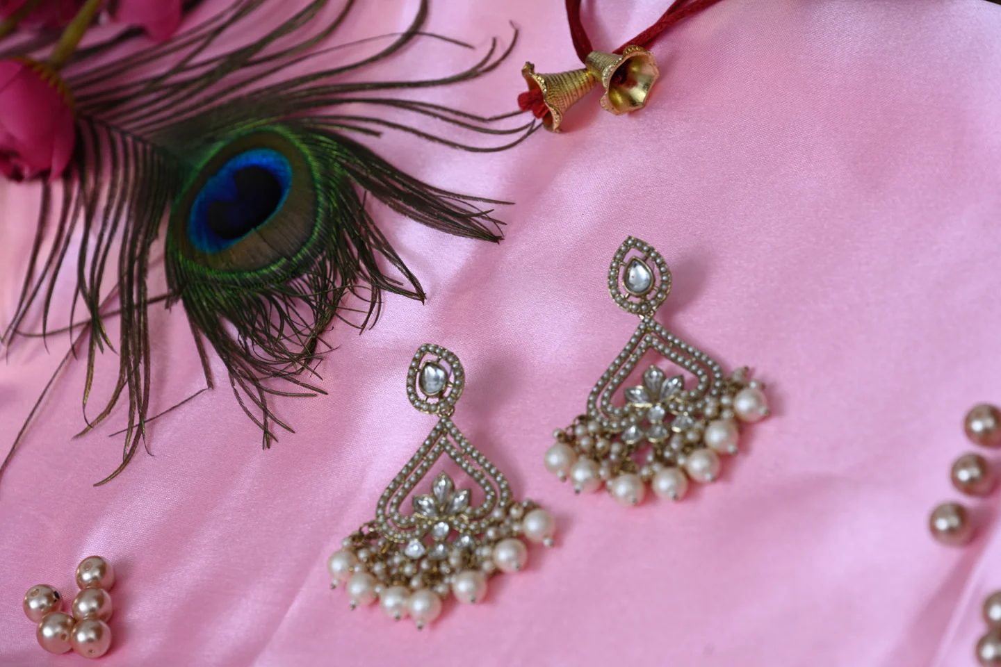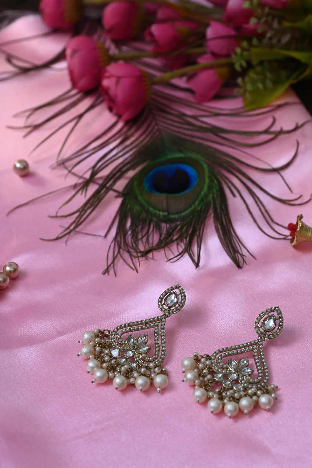 A perfect blend of heritage and elegance, these white pearl kundan earrings bring out the beauty of classic craftsmanship. Ideal for weddings and grand celebrations. Wear them with a heavily embroidered outfit and a matching maang tikka for a royal look!