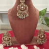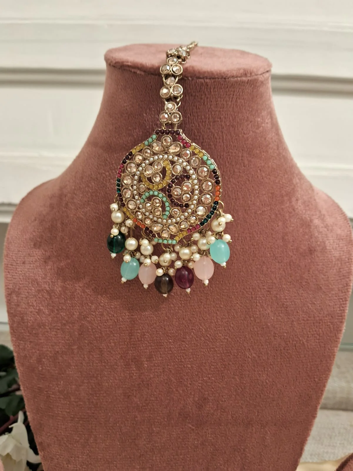 A celebration of colors and craftsmanship, these multicolored jhumkis with Tikka are perfect for sangeet nights. Wear them with a multi-hued sharara or an embroidered kurta for a statement look.
