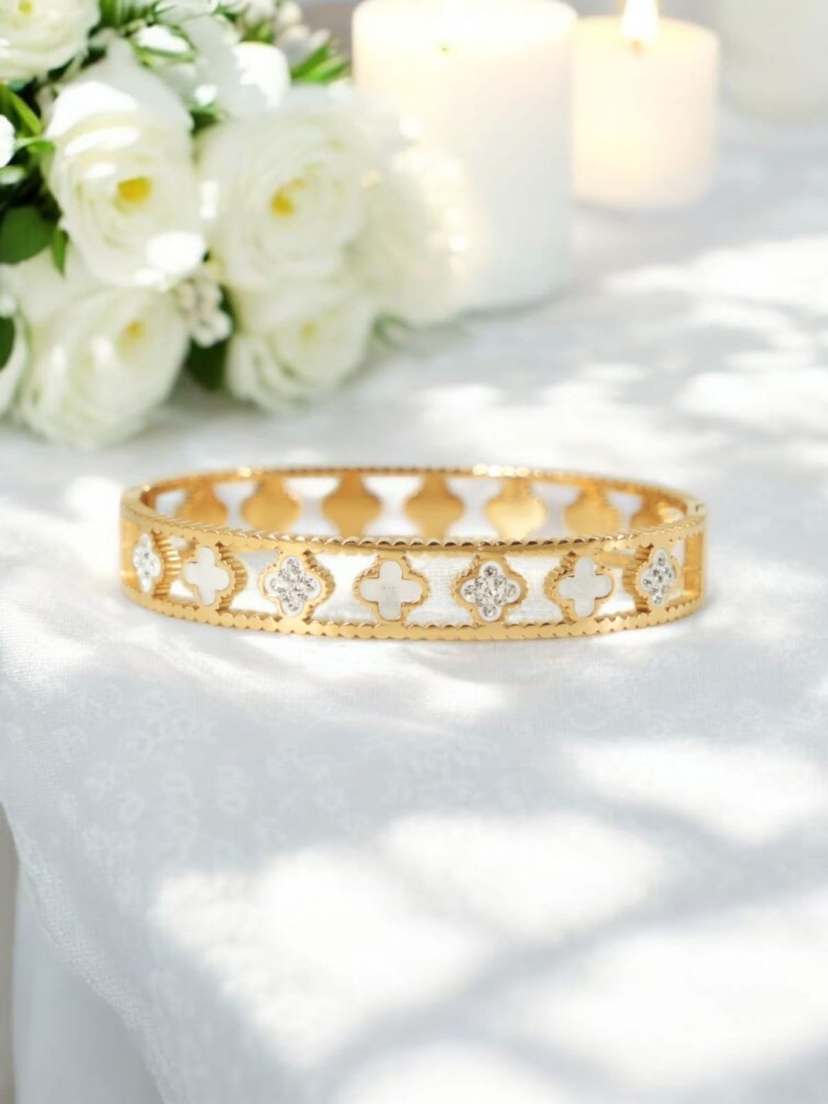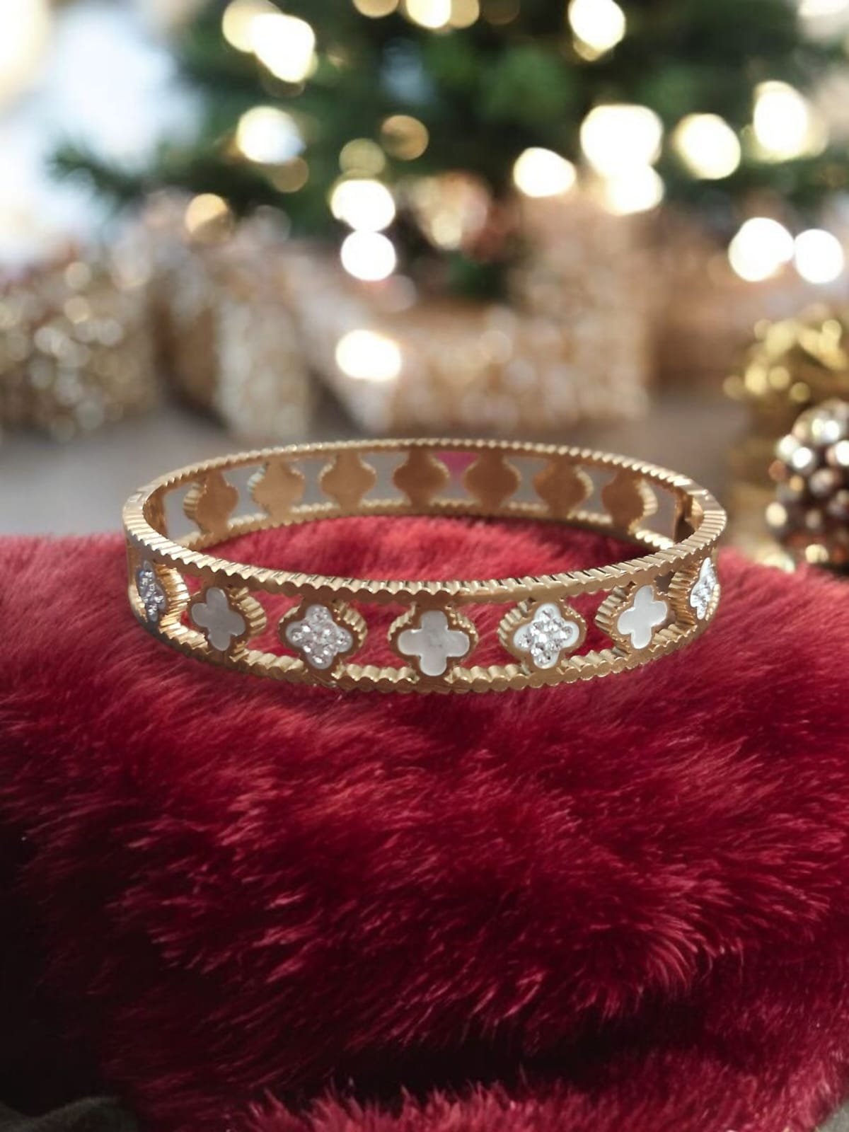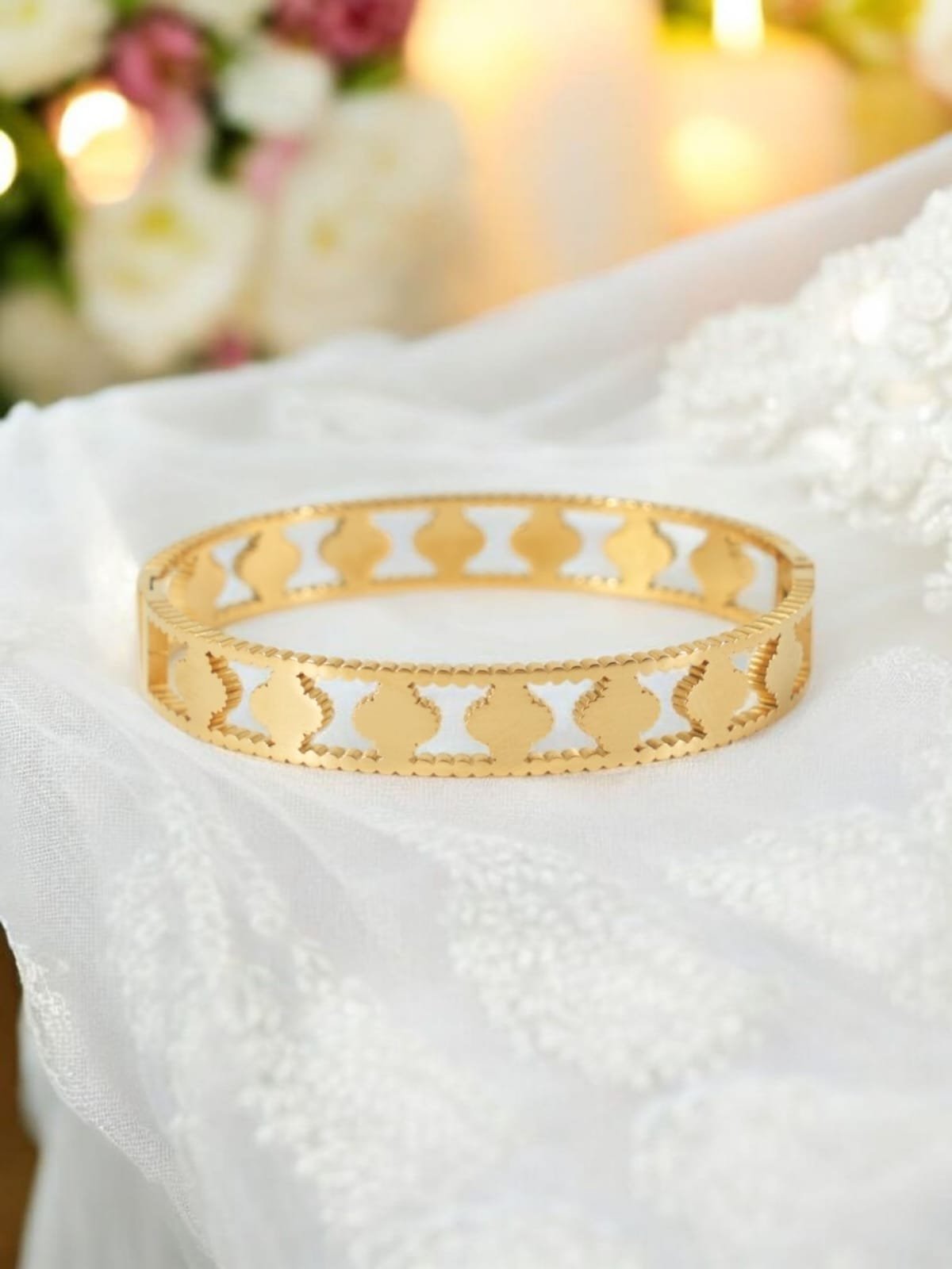 Two looks in one — our Reversible Clover & Cutout Bracelet features a stunning dual design. One side showcases traditional cutwork in matte gold for an ethnic charm, while the other side glows with pearl and stone-studded clovers for a luxe, modern twist. Crafted in an anti-tarnish finish and designed for comfort, it’s perfect for switching your style from subtle to statement effortlessly.