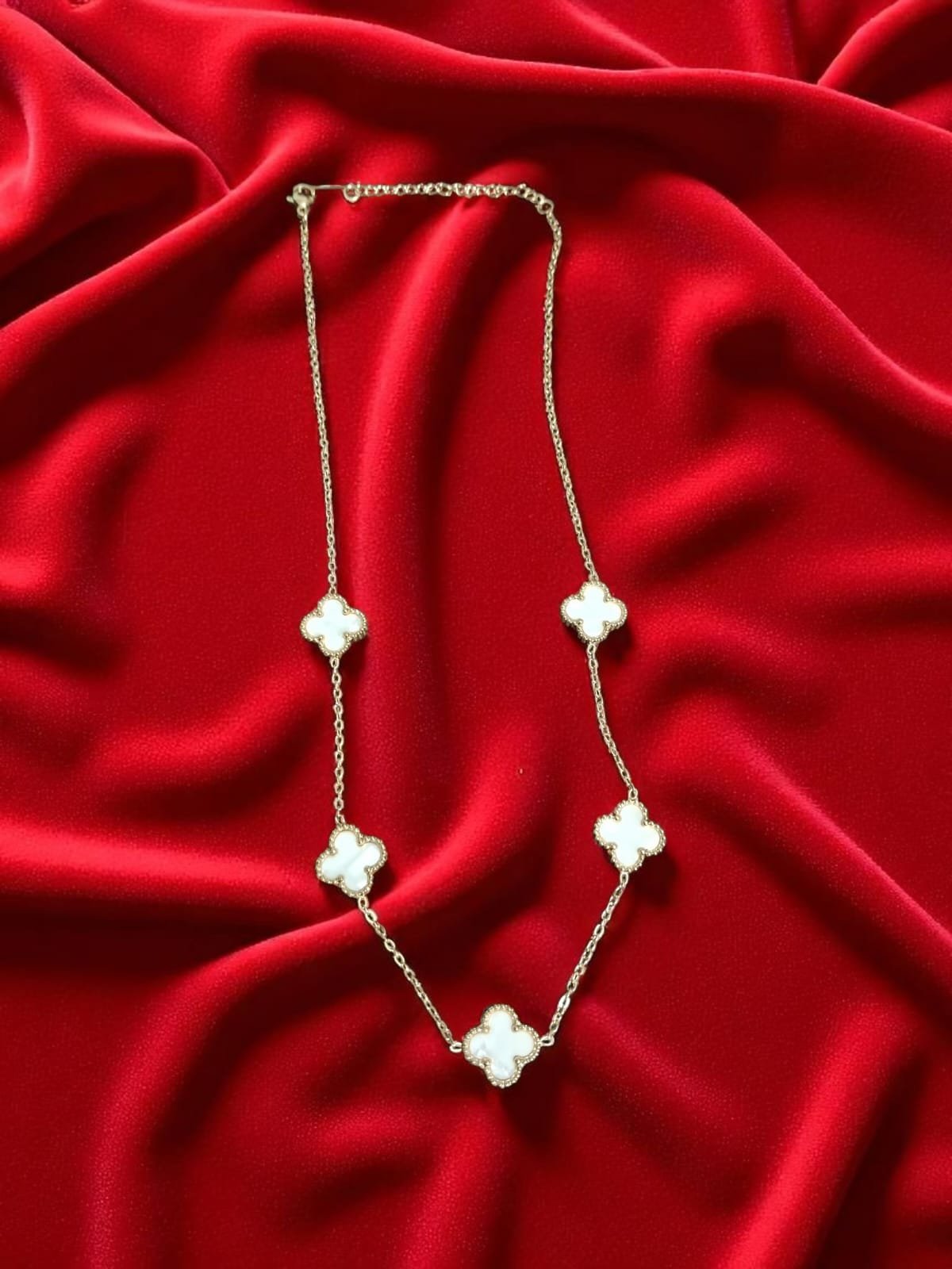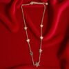 A timeless beauty, this chain features bold white clover motifs set in textured gold-toned frames. Elegant and eye-catching, it’s perfect for elevating both festive and formal looks.