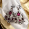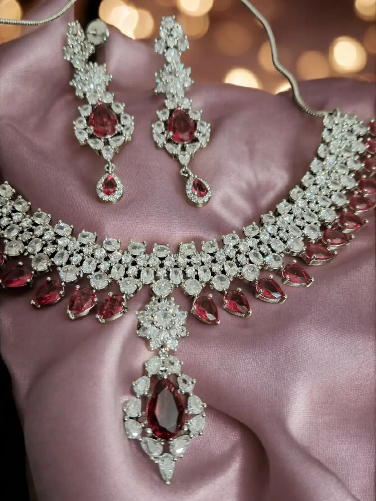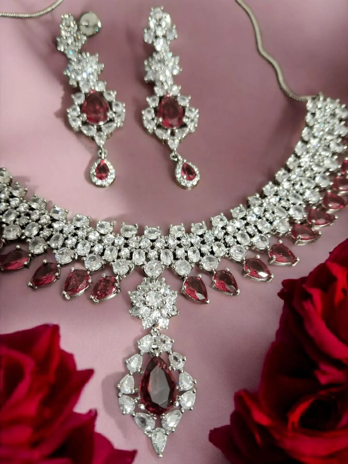 A regal mix of ruby-red and white zirconia, bringing a royal aura to any ensemble. Ideal for weddings, receptions, or evening galas, it shines the brightest when styled with a deep red saree or a heavily embroidered suit.