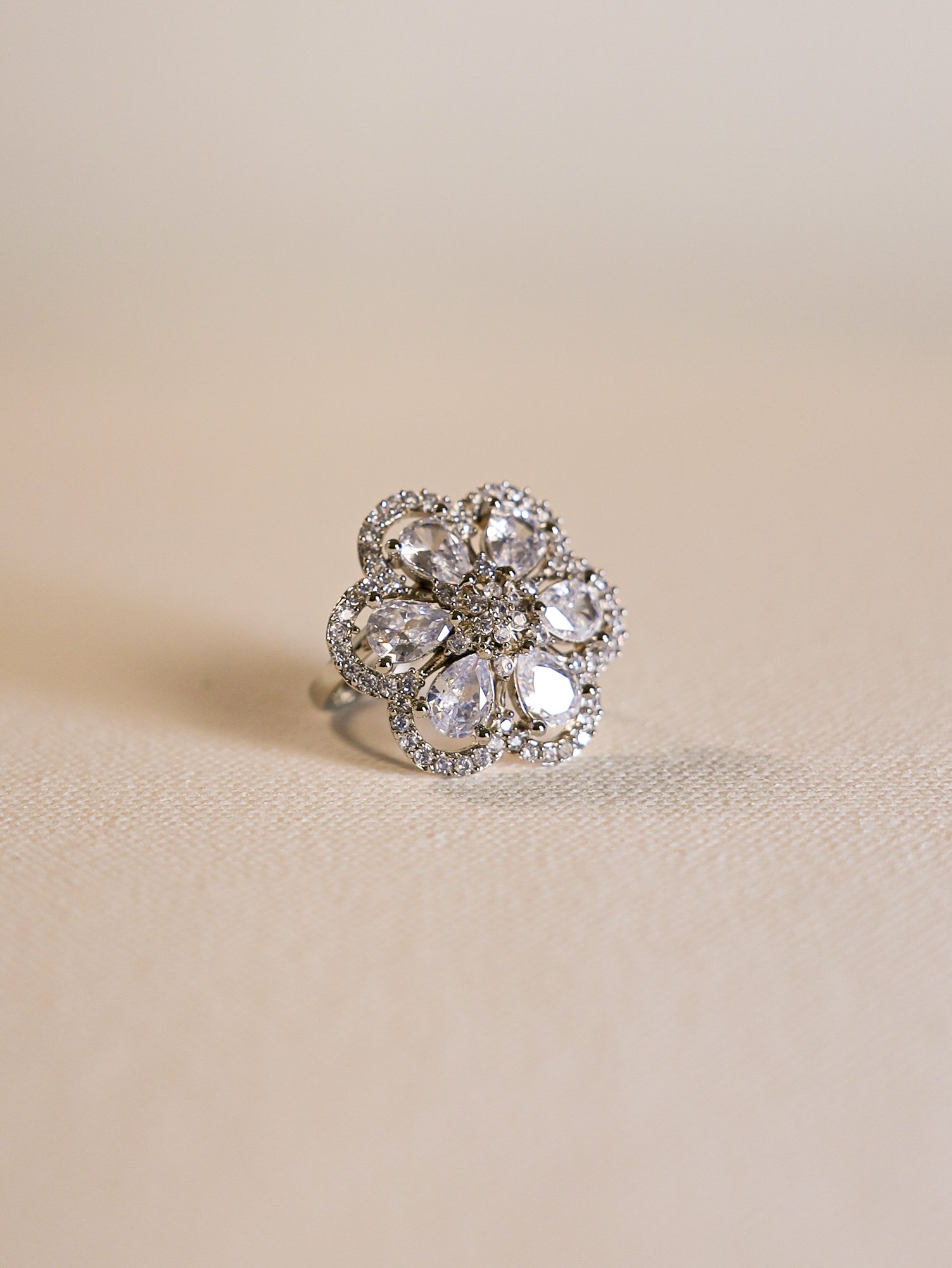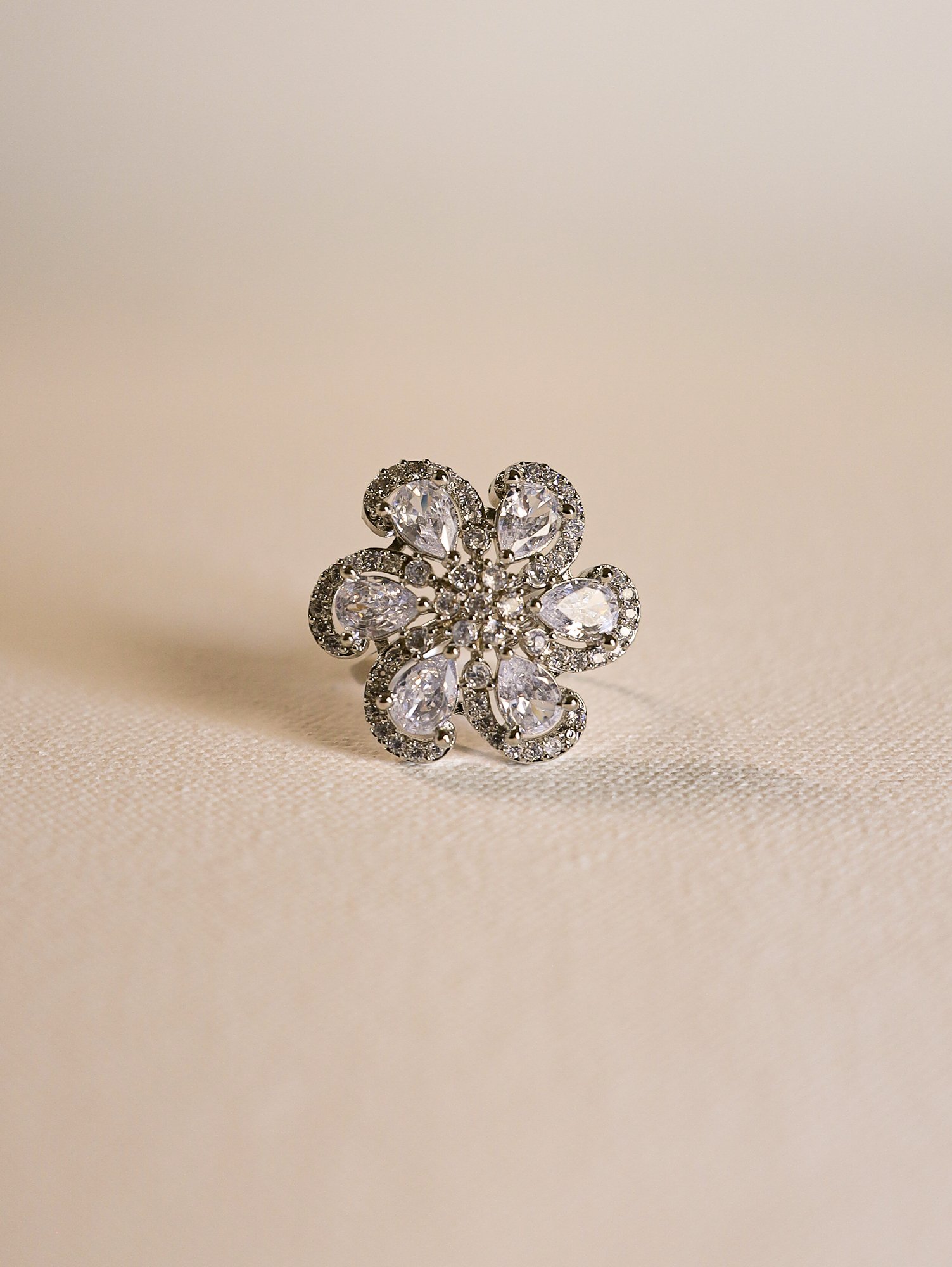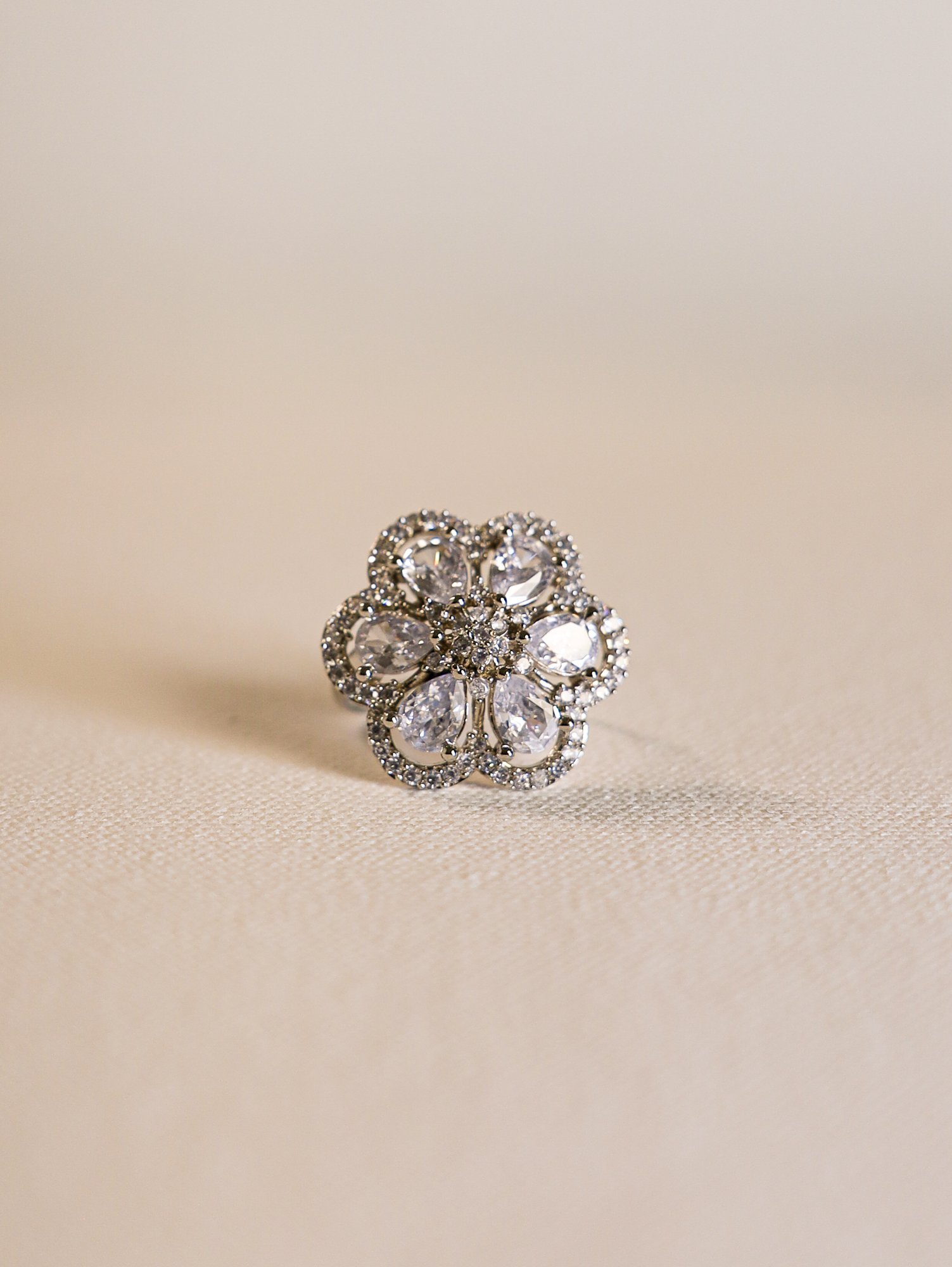 Shimmering like a starry night, this silver ring with AD embellishments is a timeless addition to any jewelry collection. Wear it with a silver-toned saree or a crisp white outfit for a celestial look