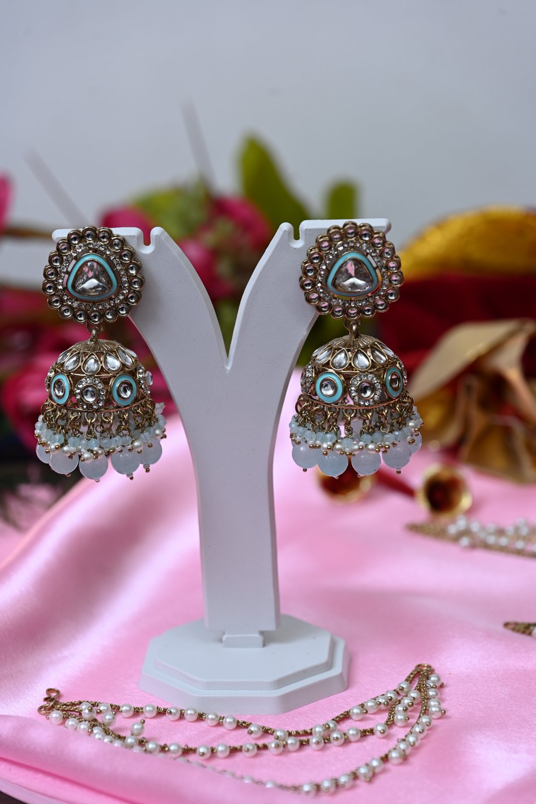 A fusion of royal elegance and desert charm, these turquoise jhumkis capture the essence of timeless beauty. The intricate gold detailing adds a regal touch, making them perfect for festive celebrations.