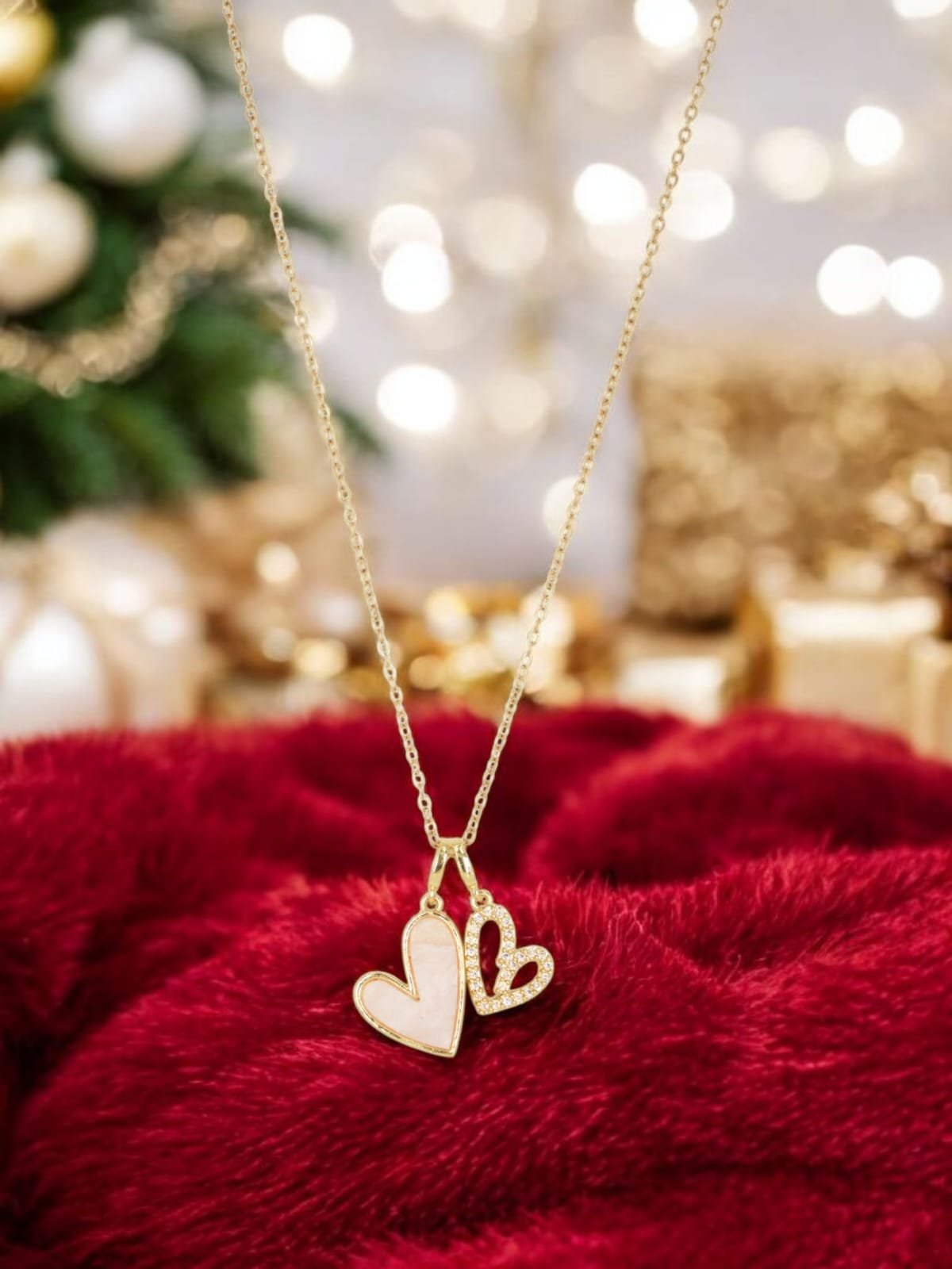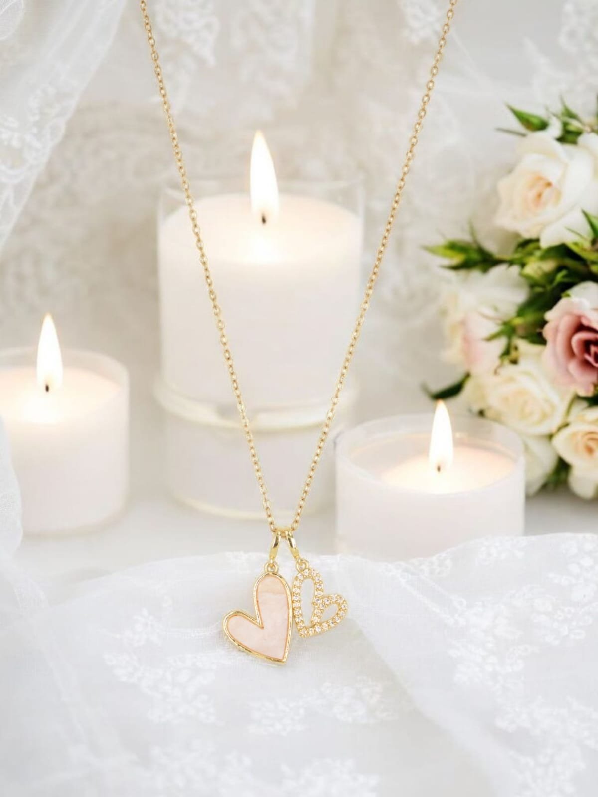Celebrate love in its purest form with our Twin Hearts Love Pendant. Featuring a soft blush enamel heart paired with a delicate, crystal-studded charm, this romantic duo hangs gracefully from a gold-toned chain — perfect for date nights, gifting, or a daily reminder of affection.