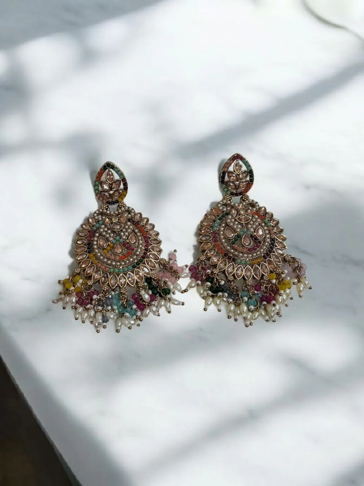 Adorn yourself with these exquisite Multi Colored Pearl Earrings, featuring intricate gold-toned detailing, multicolored gemstone accents, and delicate pearl danglers. A perfect blend of heritage and elegance, these earrings elevate any traditional attire with their regal charm.