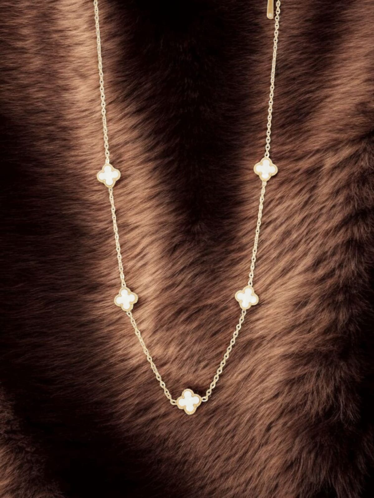 This graceful chain features evenly spaced white clover motifs on a sleek gold-tone link, offering a sophisticated yet minimalist look. A perfect blend of charm and elegance for daily styling.