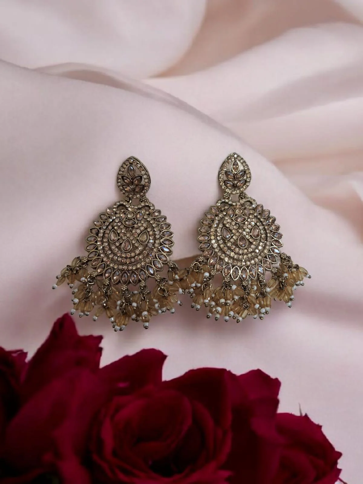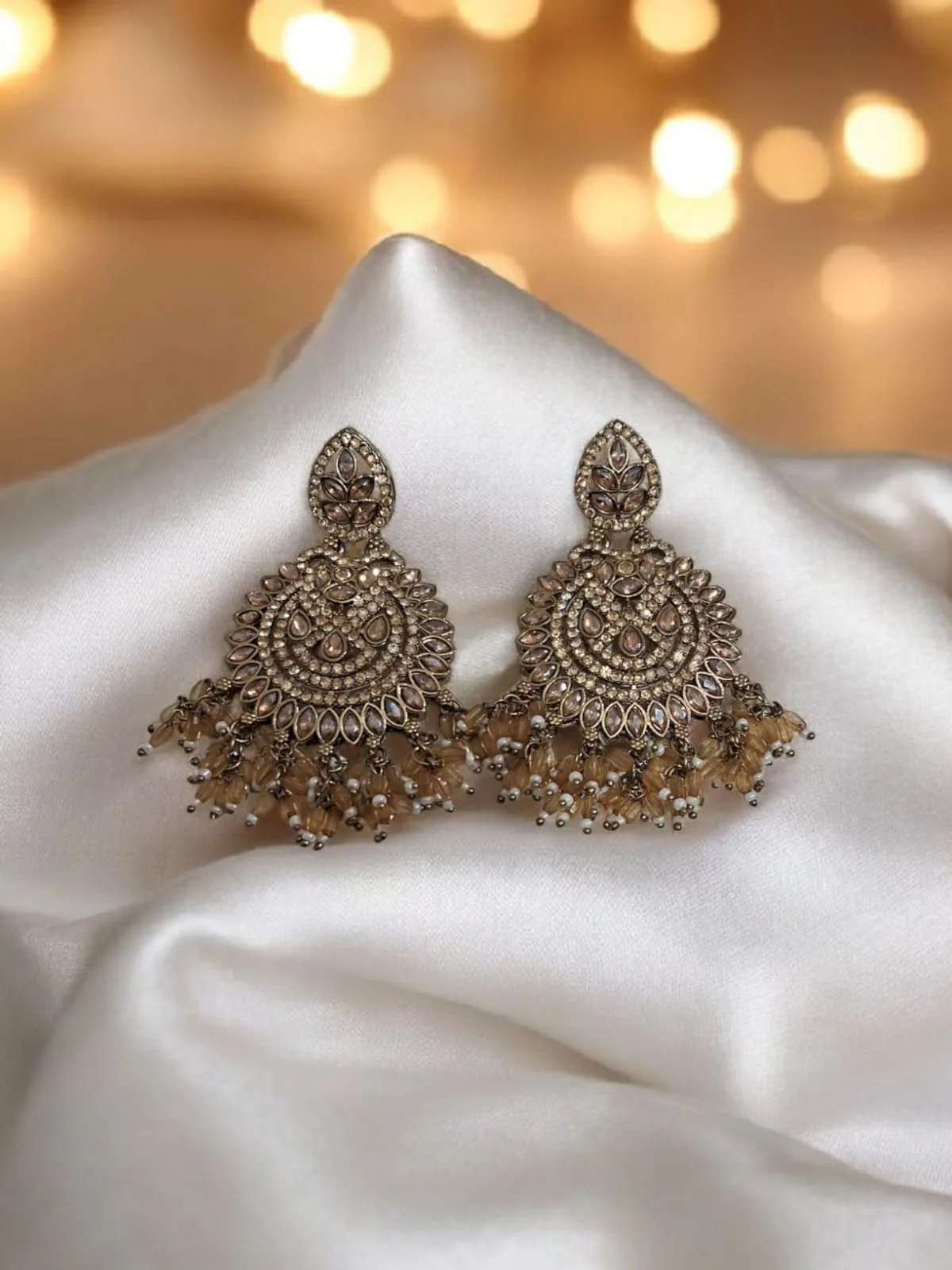 Inspired by Mughal grandeur, the Zareen Mughal Danglers blend antique gold charm with intricate stone detailing and delicate beads. These statement earrings are crafted for those who love a touch of royal heritage in their jewelry, making them perfect for celebrations and traditional attire.